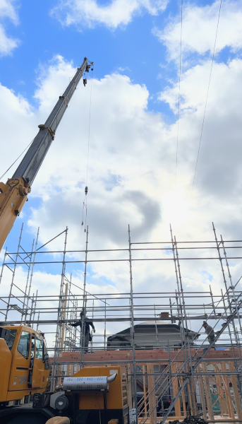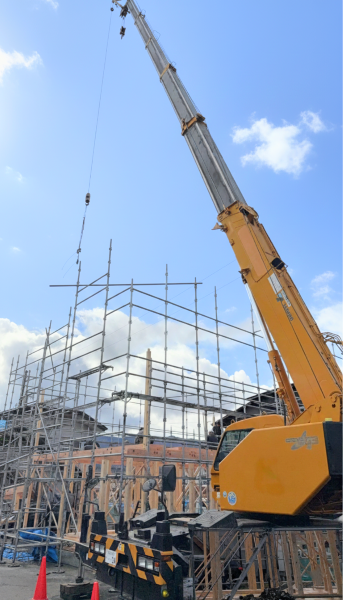 建て方作業では、【16トンのラフテレーンクレーン】を使用し、柱・梁などの部材を一つひとつ吊り上げて組み上げていきます。