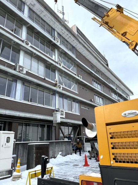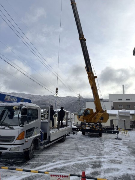 6tトラックで機器を搬入し、16tラフタークレーンにて建物内へ安全に吊り上げを行いました。