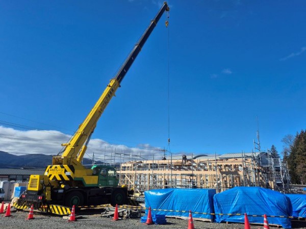 本工事では、建物の骨組みとなる構造材の吊り上げ・設置作業を中心に、安全かつスムーズな施工が求められる現場でした。現場周辺には足場や資材が多く配置されており、限られたスペースの中での作業となりましたが、事前の綿密な打ち合わせと段取りにより、効率的なクレーン作業を実現しています。