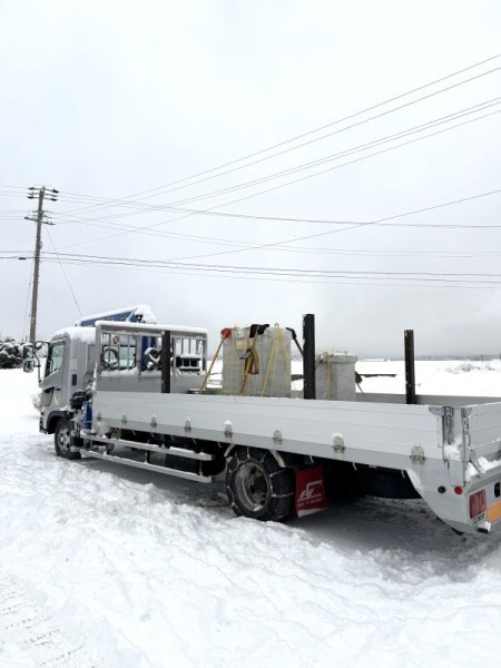 今回は雪の残る状況での作業となりましたが、アウトリガー設置箇所の確認や足元養生を徹底し、安全第一で施工しました。